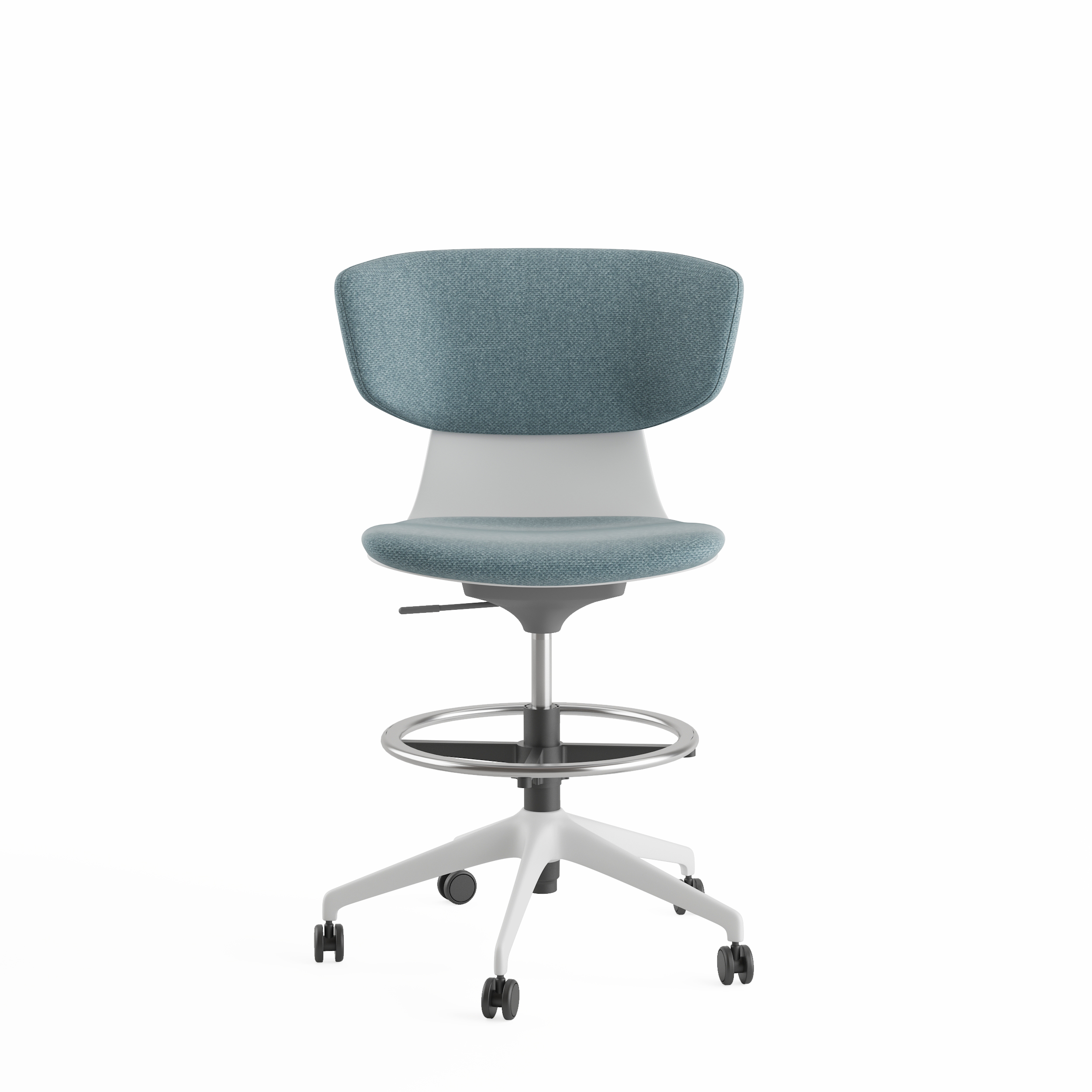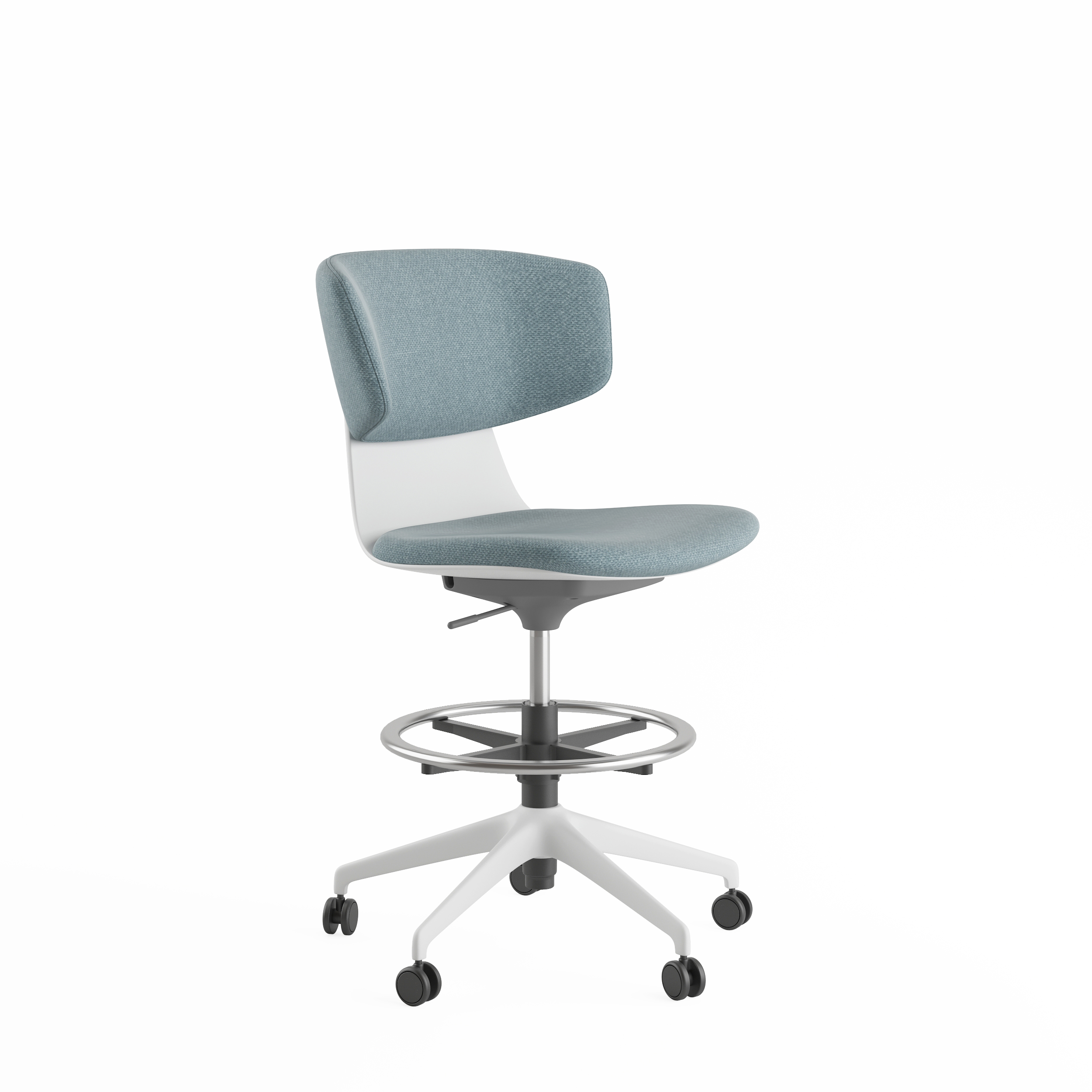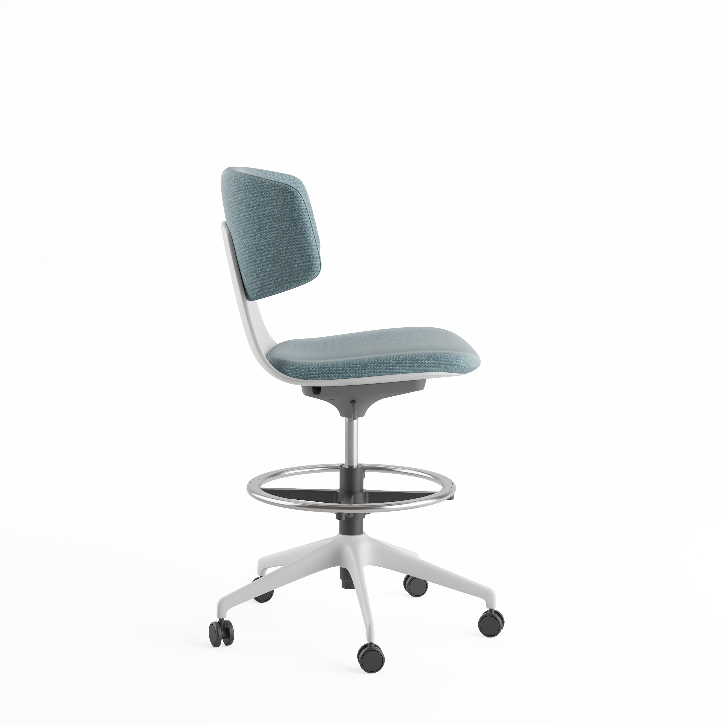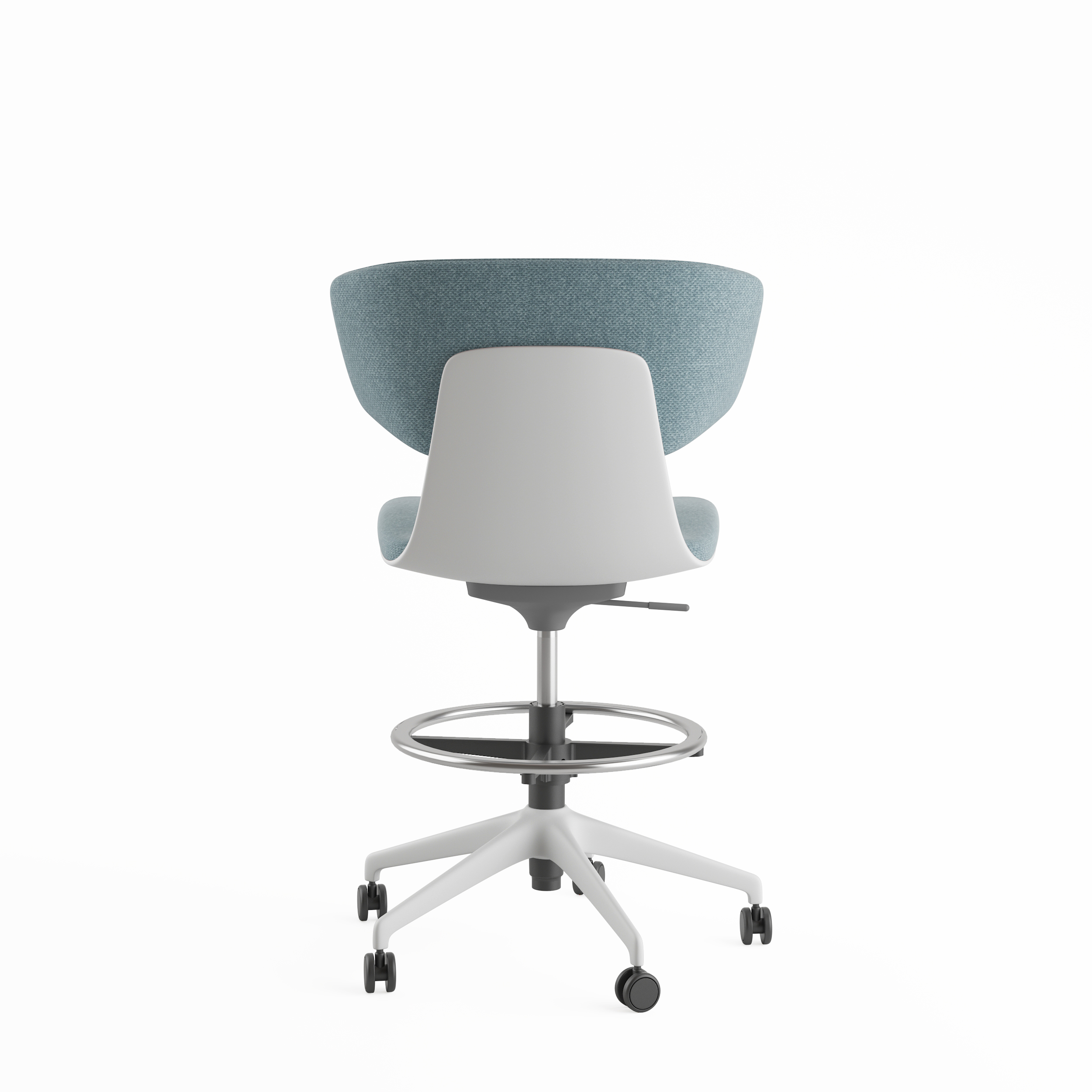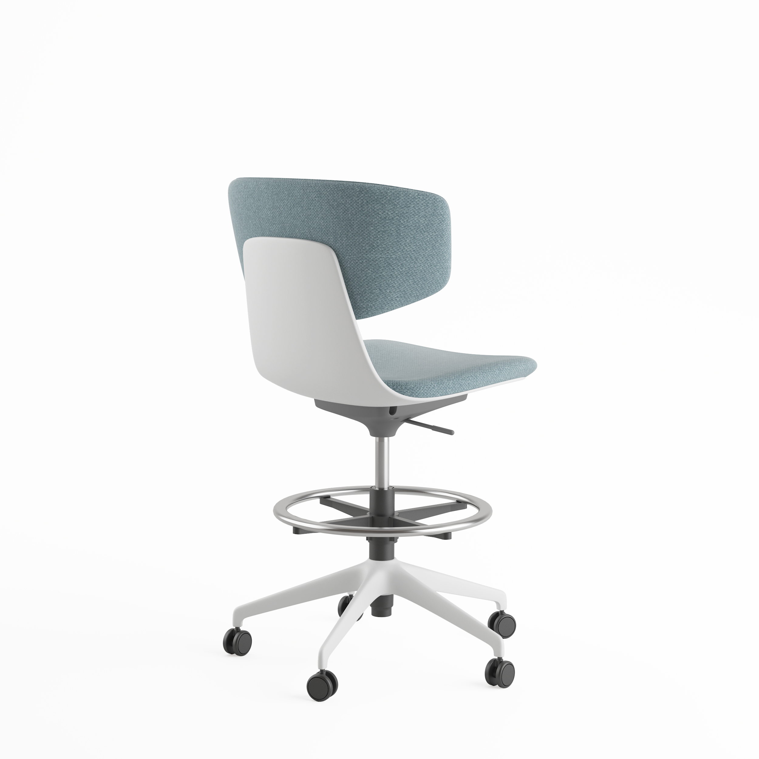 Assise et dossier en Polypropylène. Rembourrage de l’assise et du dossier en mousse moulée de 50 densités. Vérin à gaz classe 3 de 33cm. Repose-pied chromé de 45cm Avec roulettes.