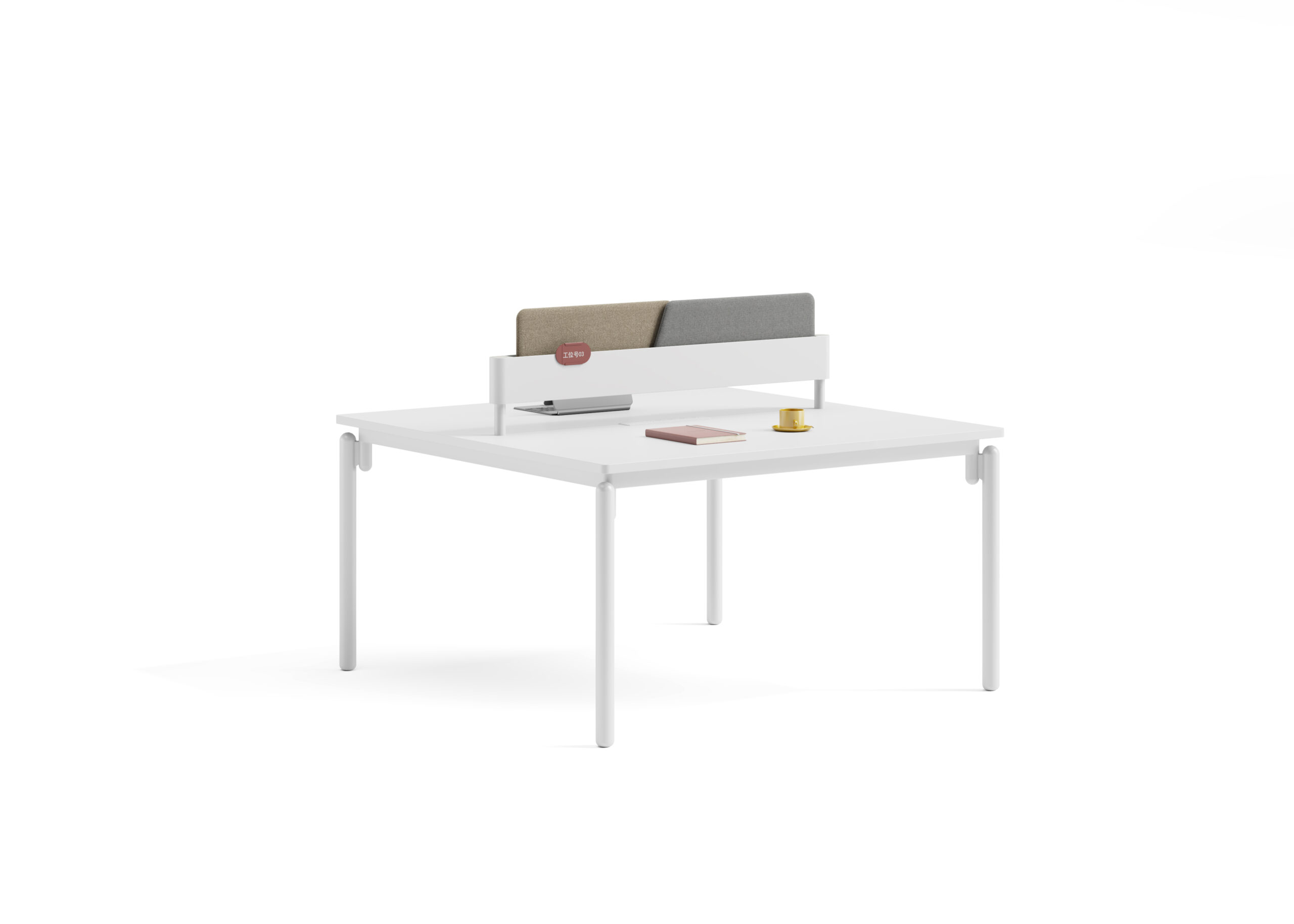 Poste de travail à 2 places équipé d’une cloison à finition tissu avec cadre en aluminium, d’un plateau en MFC et d’une structure métallique.